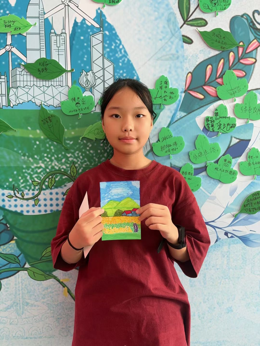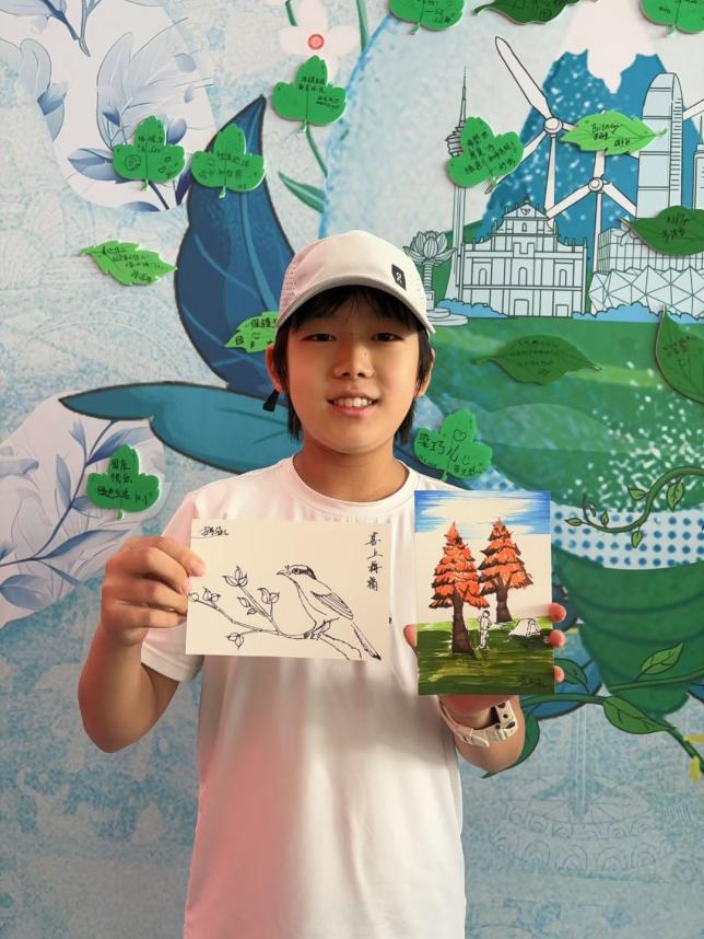 “我画的两幅明信片,一幅是小鸟站在树枝上,另一幅是两棵高大的树木。小鸟代表着自然,它们自由地栖息在安全、干净的环境中。在未来的城市里,树木和建筑可以共生,人们在这里既幸福生活,又不破坏环境。”一位小画家骄傲地展示着她的明信片,画面中洋溢着对生态城市的美好愿景。